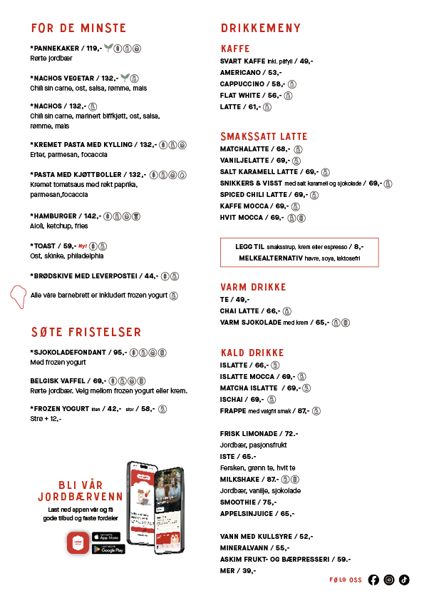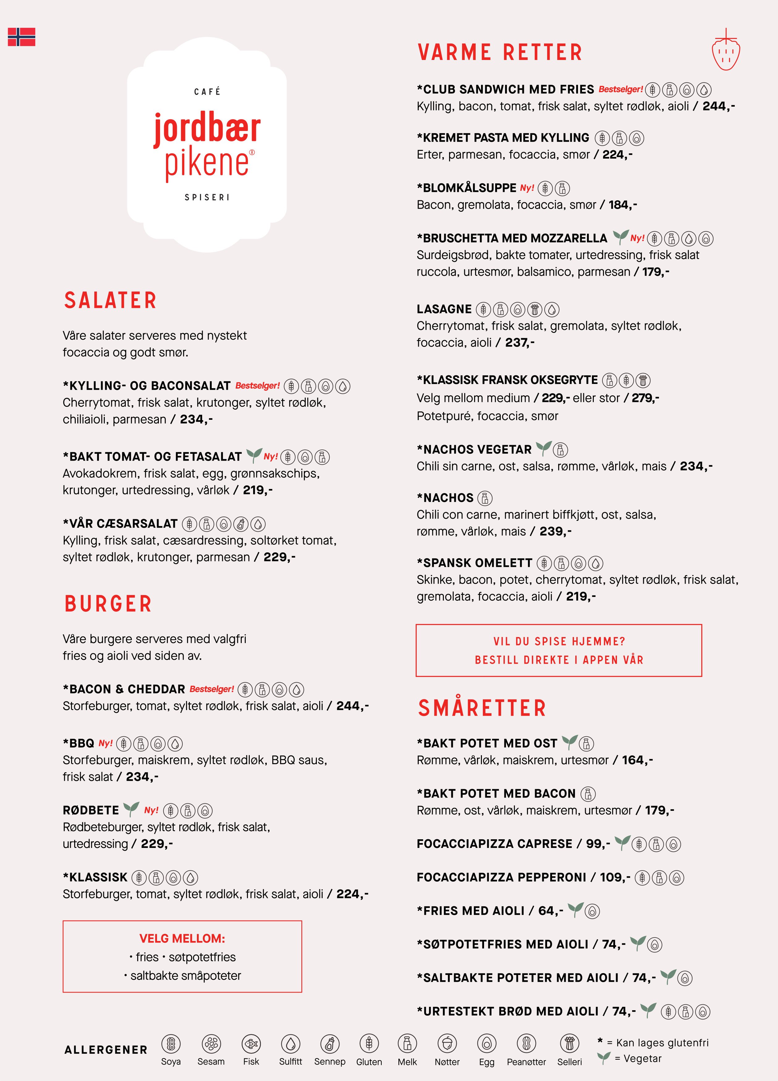 Vi serverer et raust utvalg av lunsj, varme retter og middag på Jordbærpikenes eget vis. Velg fra våre retter på hovedmenyen, eller se vår lokale disk og utvalg fra kakedisken.